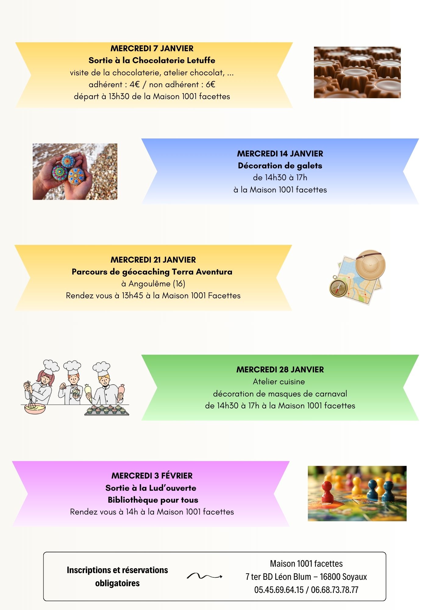Ateliers parents/enfants les mercredis après midi. Plusieurs activités sont proposées, sorties, activités manuelles, atelier cuisine, … Renseignements et inscriptions à la Maison 1001 facettes au 05.45.69.64.15 ou au 06.68.73.78.77