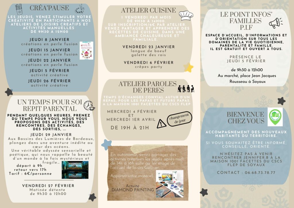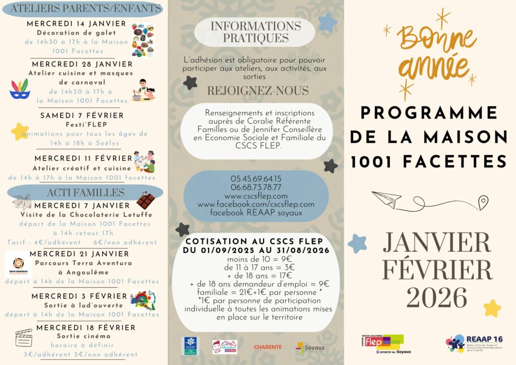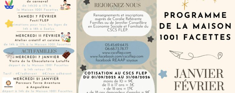 Programmation du mois de janvier et février. Renseignements, inscriptions et réservations auprès de la Maison 1001 facettes