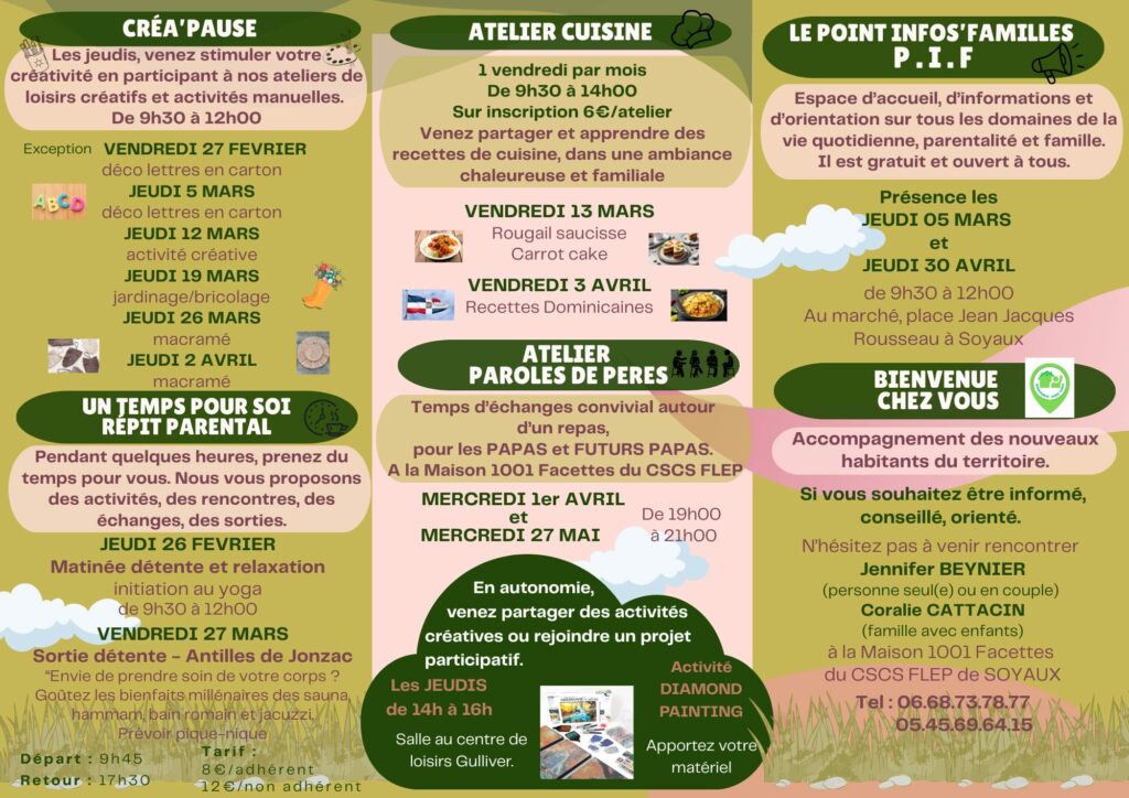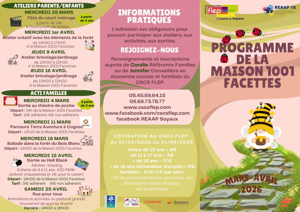 Programmation de Mars et Avril pour la Maison 1001 facettes, inscriptions et renseignements auprès de Coralie et/ou Jennifer.